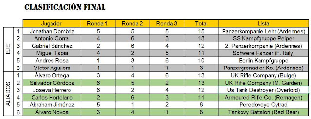 Tres compañías Panzer, encima Always Attack las tres (¿¡para qué jugarlas existiendo la Westfalen!?), copando el podio. Y luego el loco con los Tigres. Y por el otro lado, el podio aliado con dos rifles británicas arriba. Sea como fuere, fue otro gran día de hobby, ¡y que estoy seguro que se repetirá!